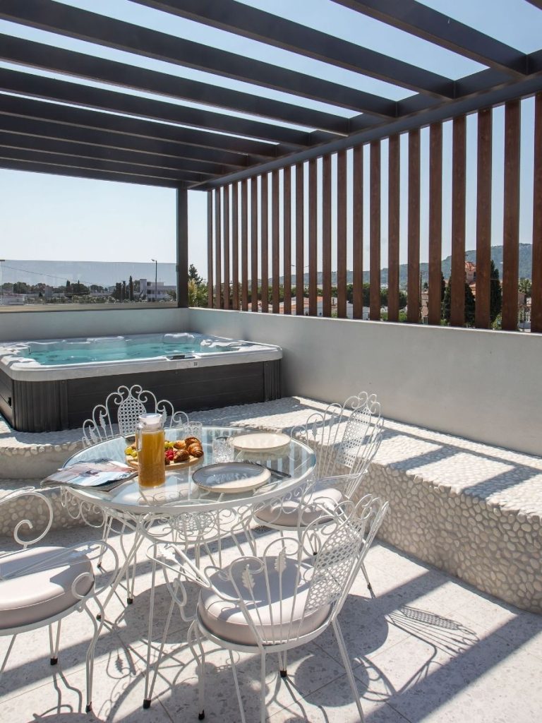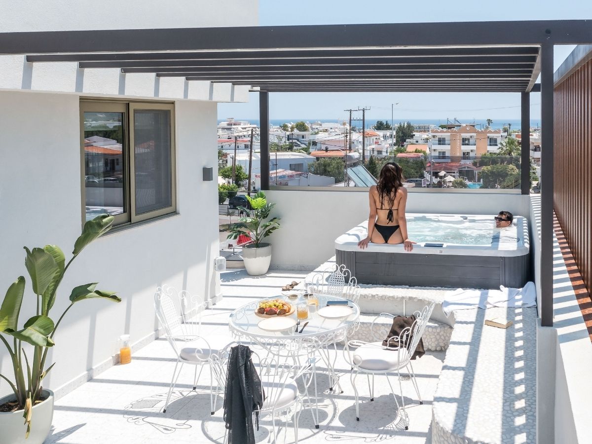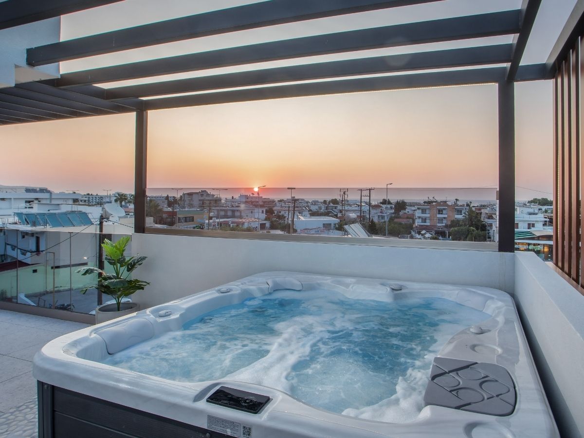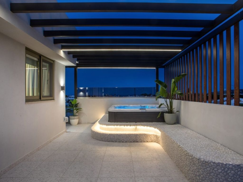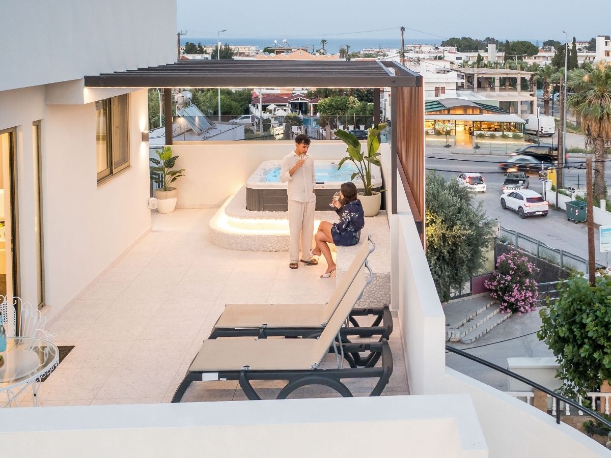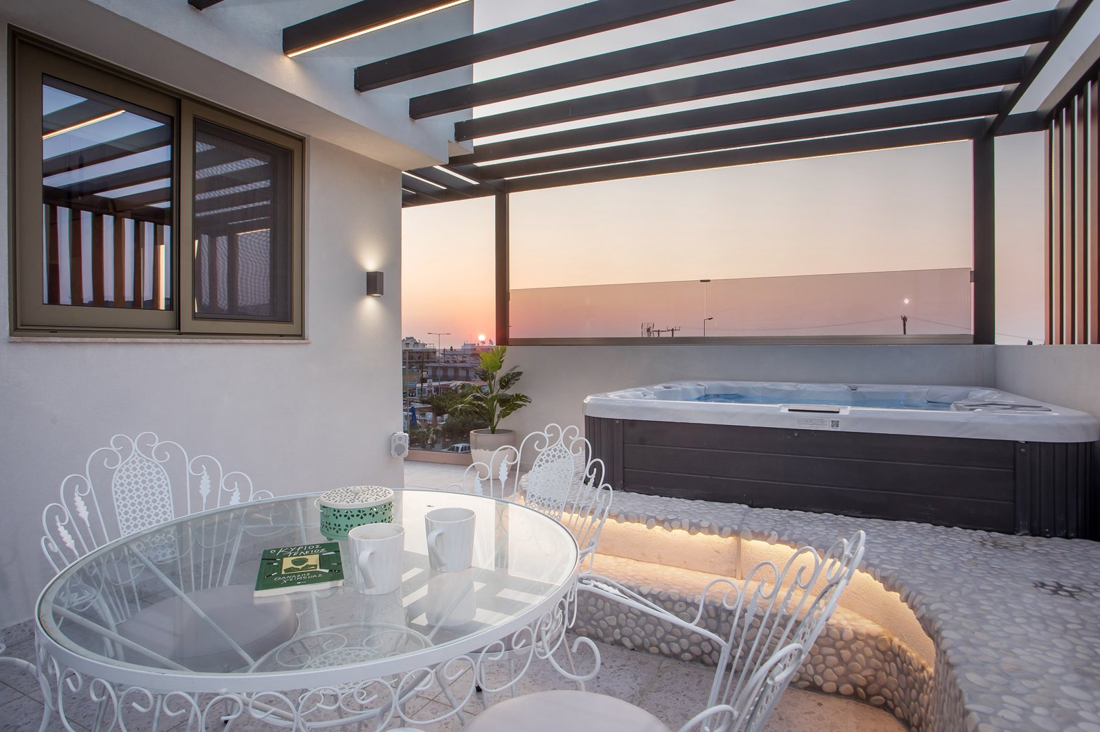 Our elegant suite offers two spacious bedrooms, a fully equipped kitchen with modern appliances, and a stylish bathroom. The highlight is the expansive private terrace, featuring a hydromassage pool and comfortable sun loungers. Enjoy all essential home comforts, including a washing machine and hairdryers, ensuring convenience and relaxation throughout your stay.