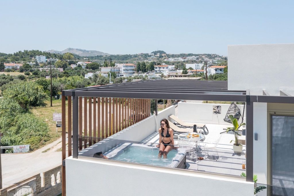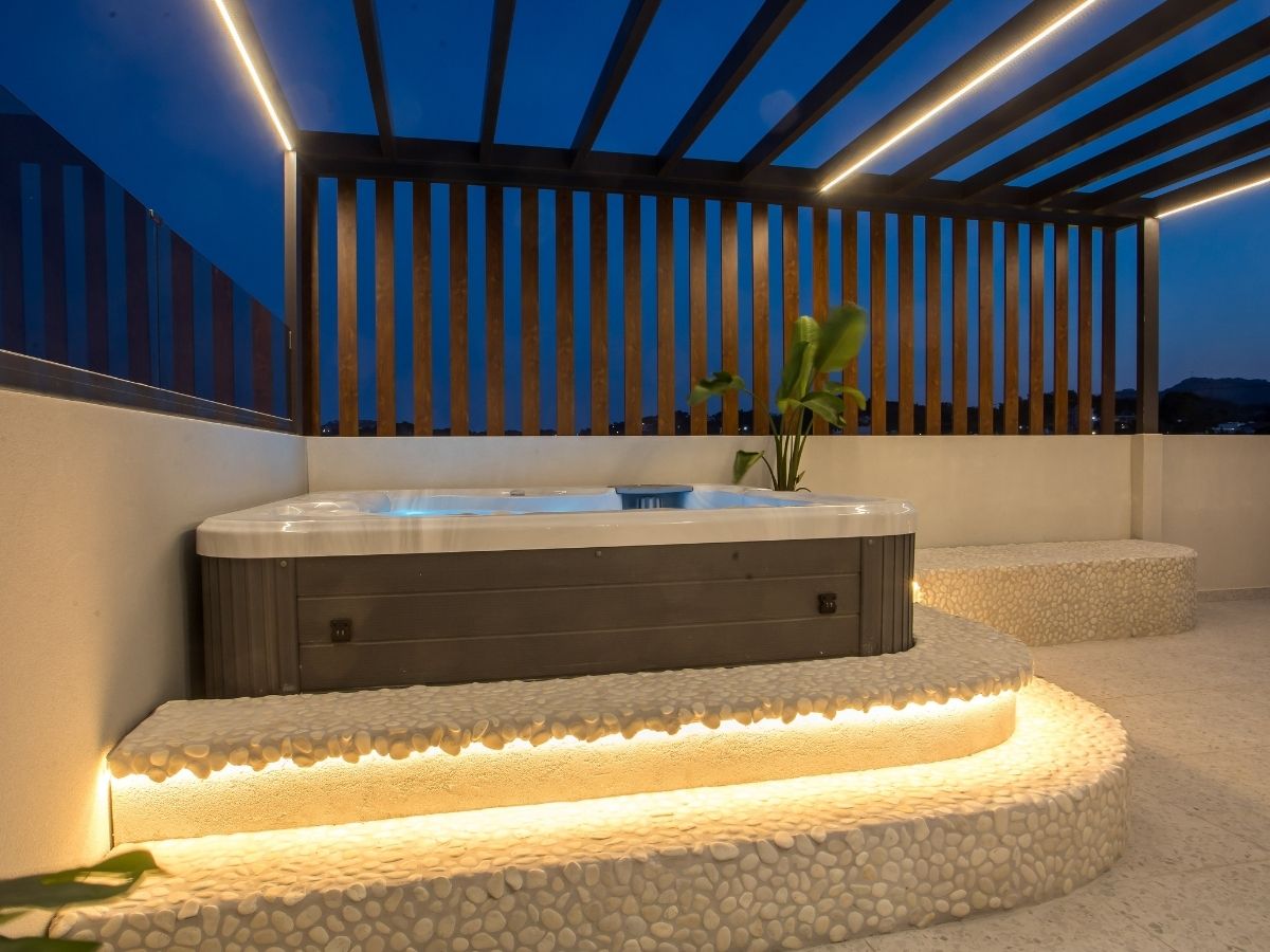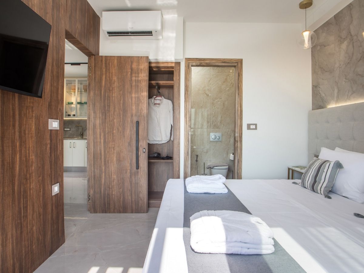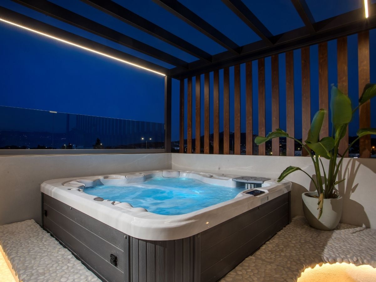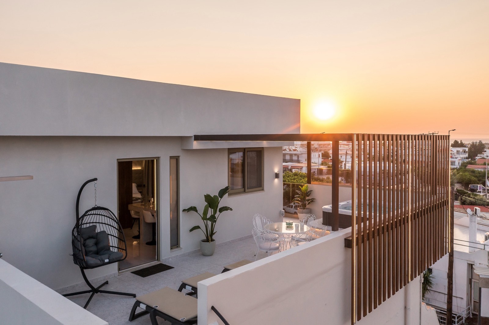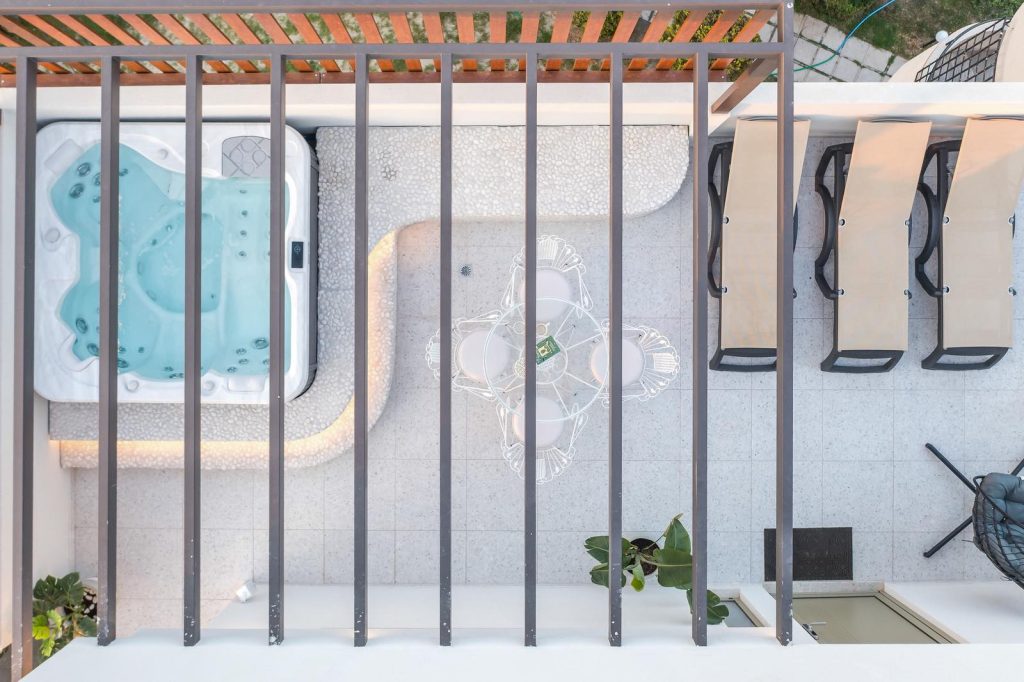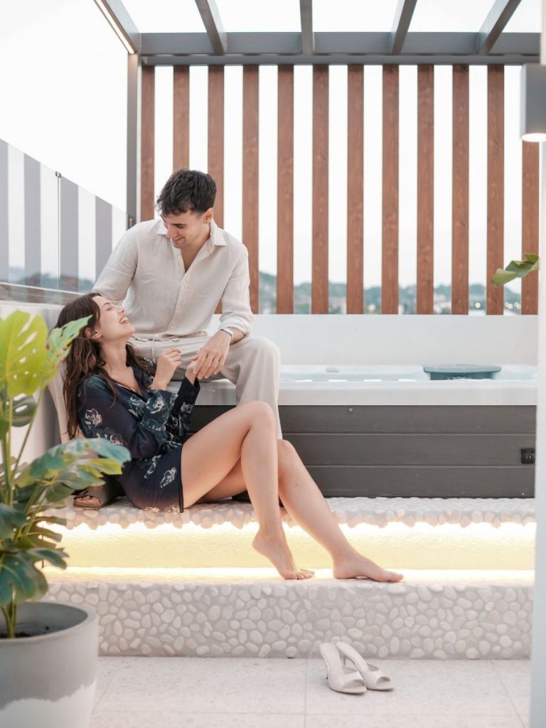 Our elegant suite offers two spacious bedrooms, a fully equipped kitchen with modern appliances, and a stylish bathroom. The highlight is the expansive private terrace, featuring a hydromassage pool and comfortable sun loungers. Enjoy all essential home comforts, including a washing machine and hairdryers, ensuring convenience and relaxation throughout your stay.