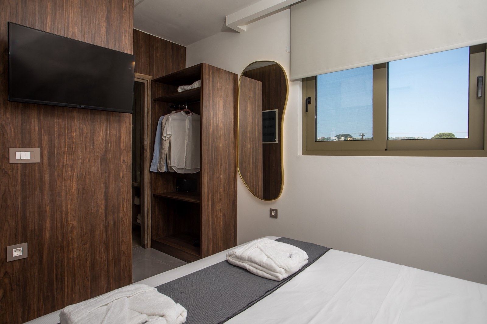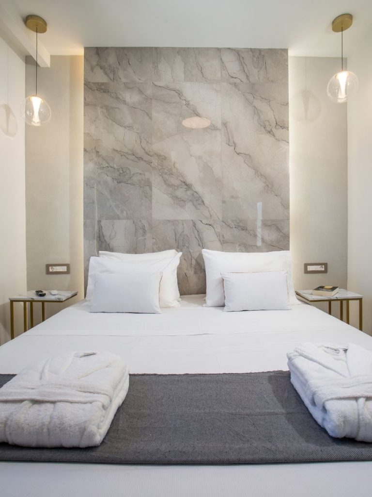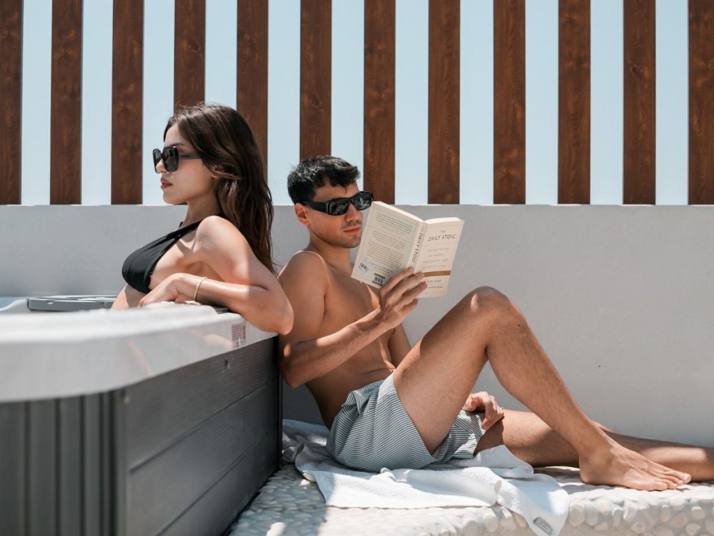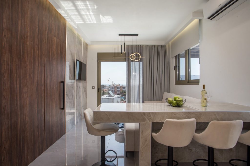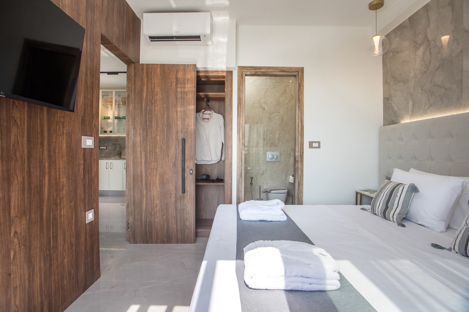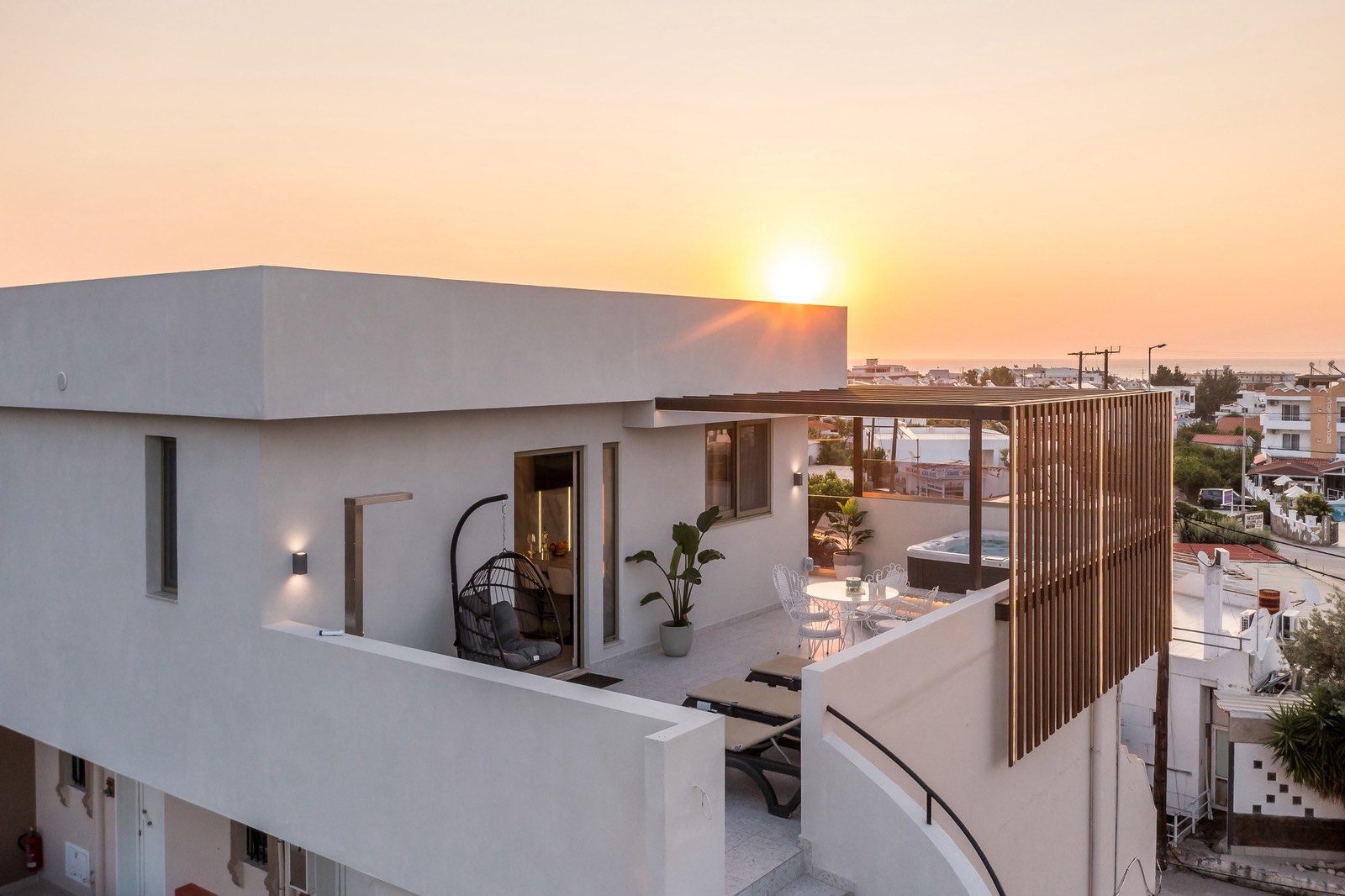 Our elegant suite offers two spacious bedrooms, a fully equipped kitchen with modern appliances, and a stylish bathroom. The highlight is the expansive private terrace, featuring a hydromassage pool and comfortable sun loungers. Enjoy all essential home comforts, including a washing machine and hairdryers, ensuring convenience and relaxation throughout your stay.